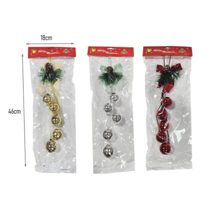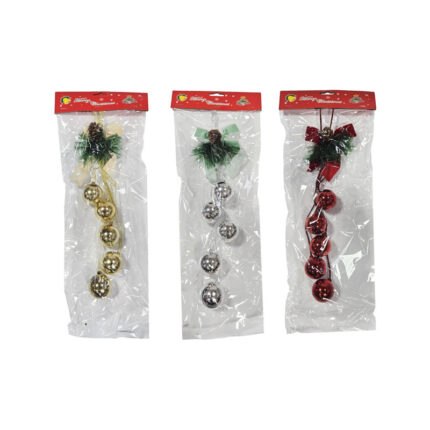 Κρεμαστή χριστουγεννιάτικη διακόσμηση με τέσσερις λαμπερές μπάλες, κουκουνάρι και φιόγκο, ιδανική για να στολίσει πόρτες, παράθυρα, τοίχους ή το δέντρο